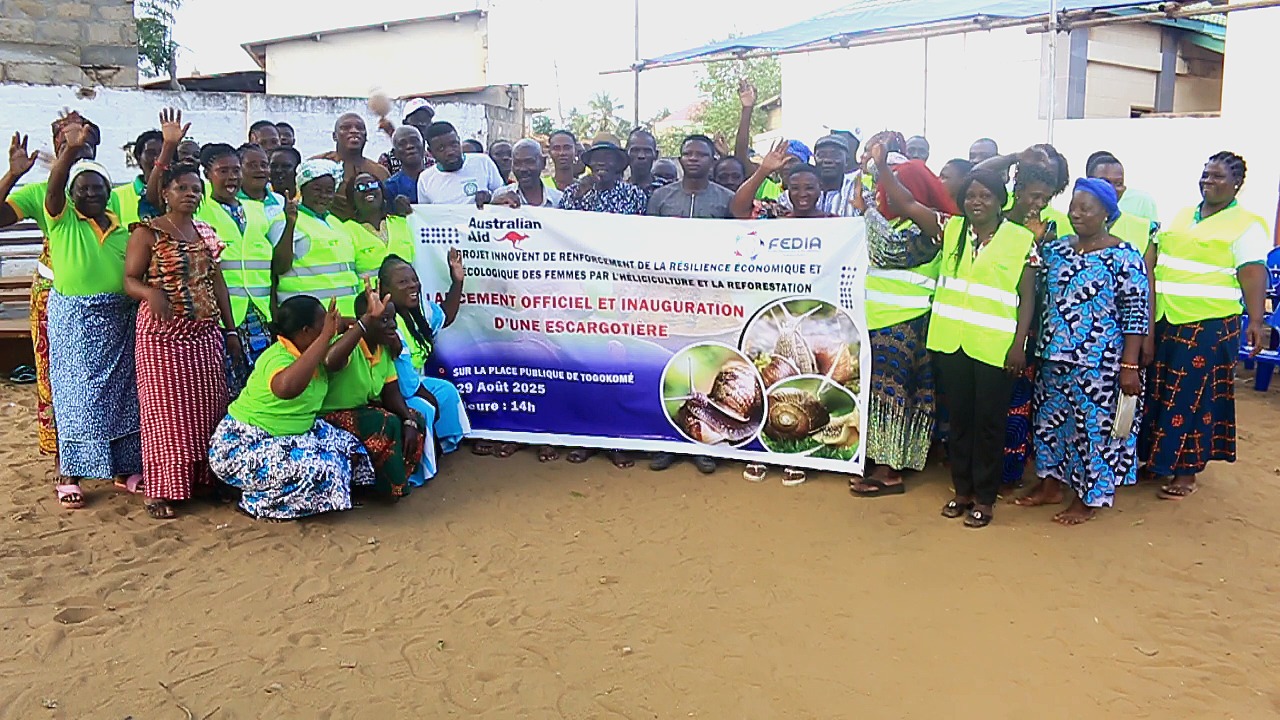 Le 29 août 2025, le petit village côtier de Togokomé, dans la commune des Lacs 3, a vibré au rythme de chants, de danses et d’espoir. Sur la place publique, femmes, notables, autorités locales et partenaires se sont réunis pour célébrer un moment historique : le lancement officiel du « Projet Innovant de Renforcement de la Résilience Économique et Écologique des Femmes de Togokomé par l’Héliciculture et la Reforestation », initié par l’association FEDIA (Familles Engagées pour le Développement Inclusif en Afrique) avec le soutien financier de l’Ambassade d’Australie à travers Australian Aid. Un projet porteur d’avenir Ce projet ambitieux vise à répondre à un double défi : la dégradation de l’environnement et la précarité économique des femmes. À travers la mise en place d’une escargotière communautaire, le reboisement de plus de 2,5 hectares, et la création de deux coopératives simplifiées – YAYRA et FEYA – FEDIA entend offrir aux…
